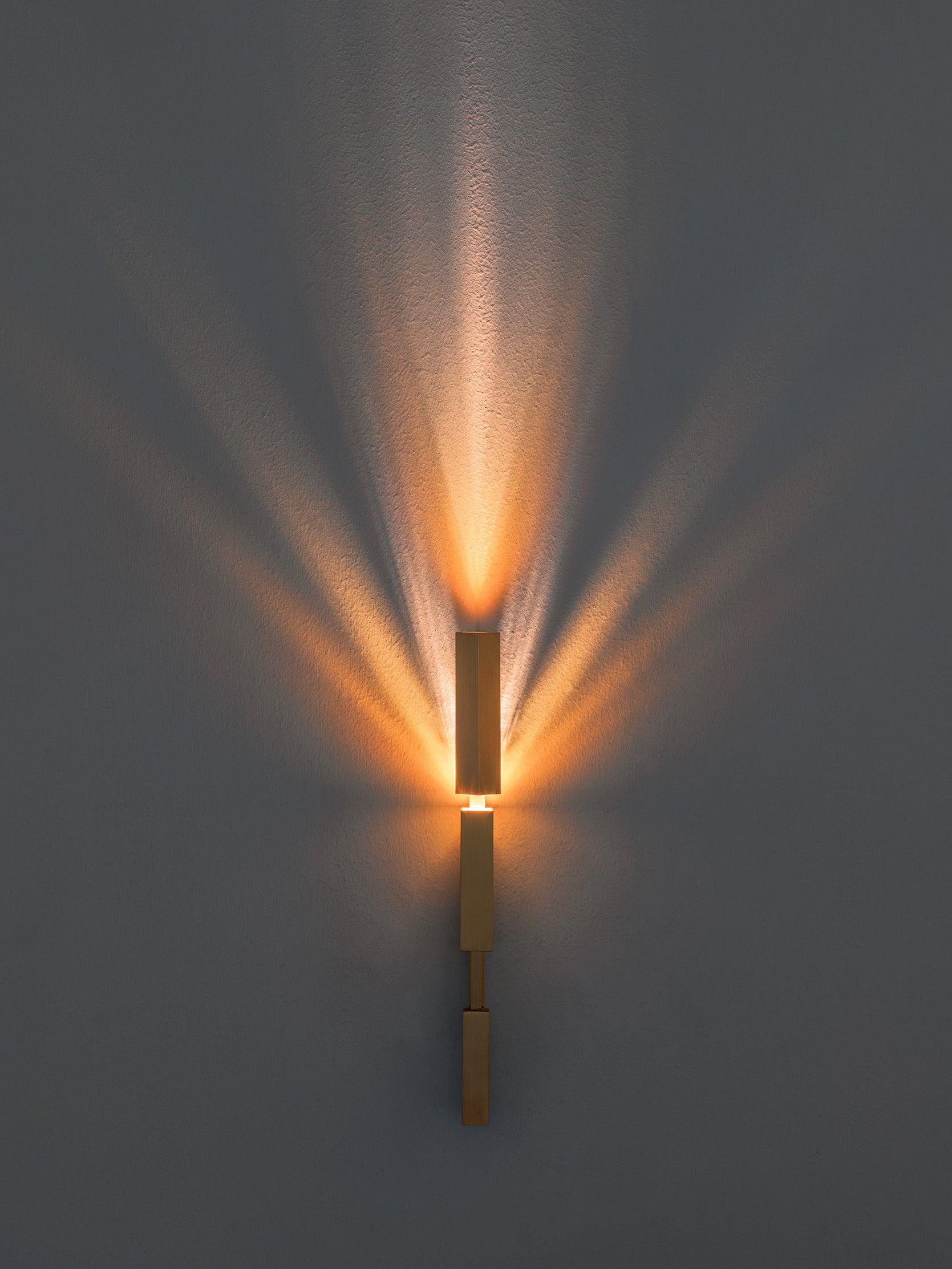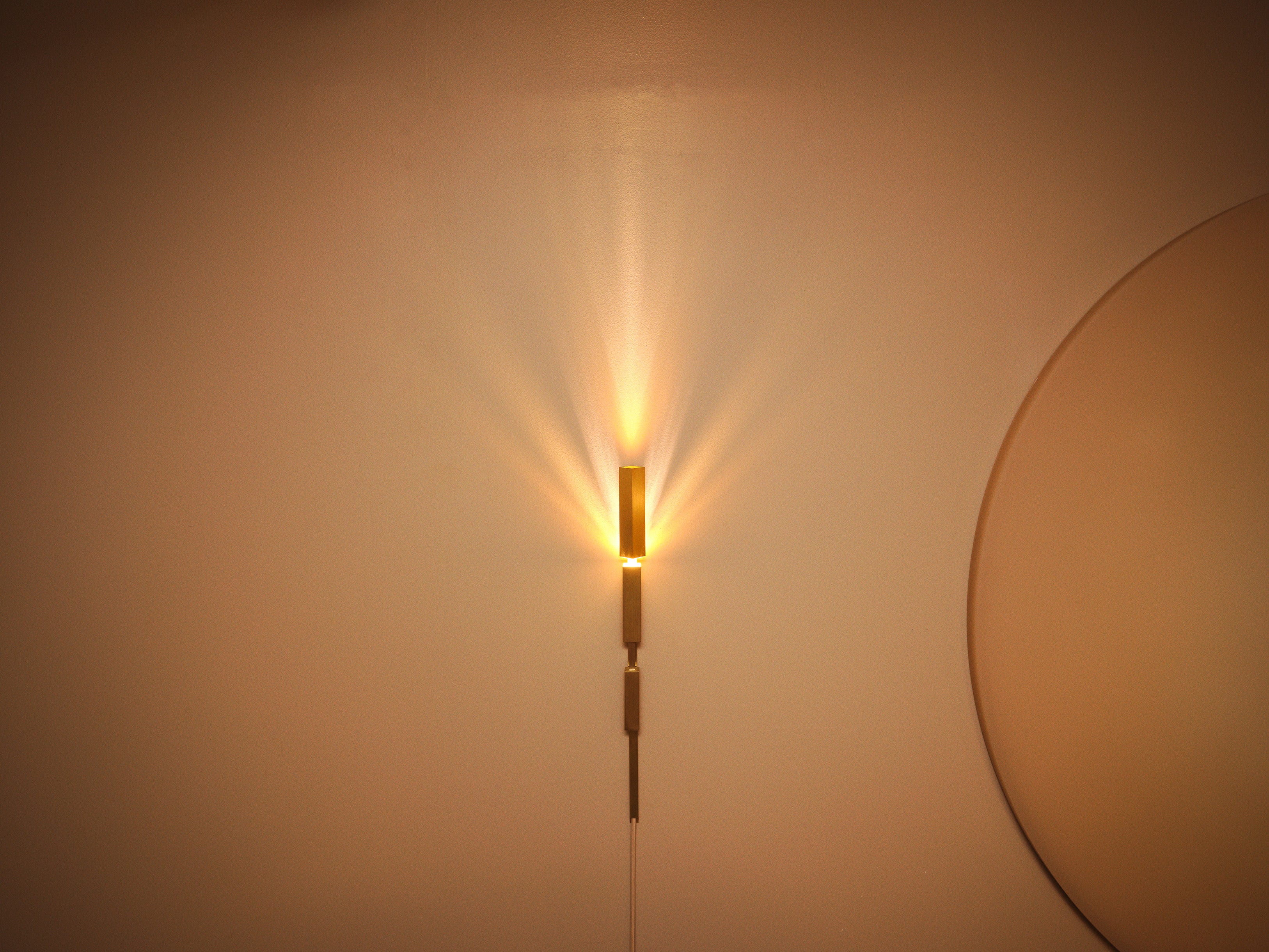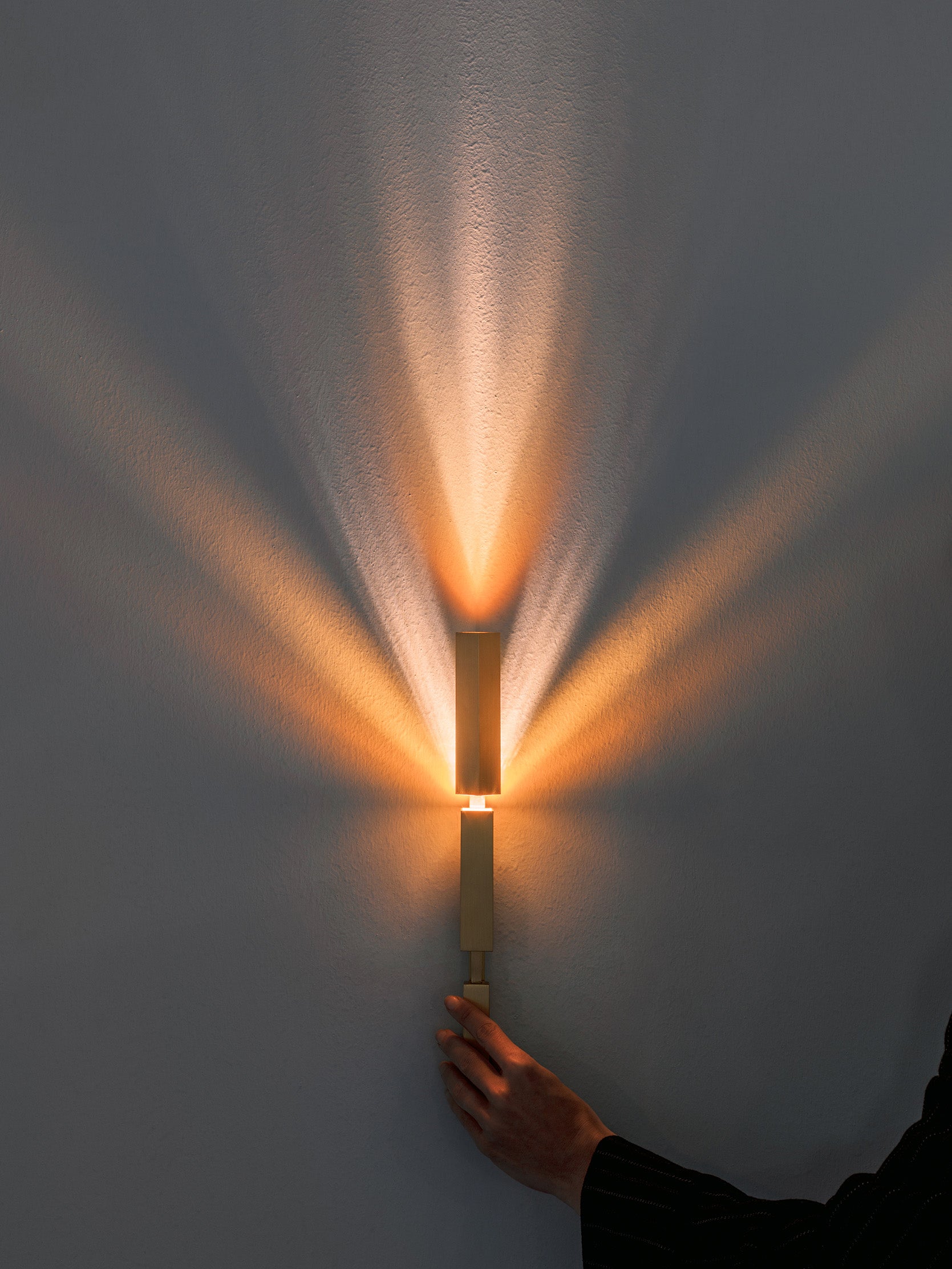 The wall-mounted piece is a brass sconce that scatters light into multiple rays with varying colour temperatures. The lamp is interactive and can be manually adjusted to modify the intensity and projection pattern: A reimagined dimming effect.