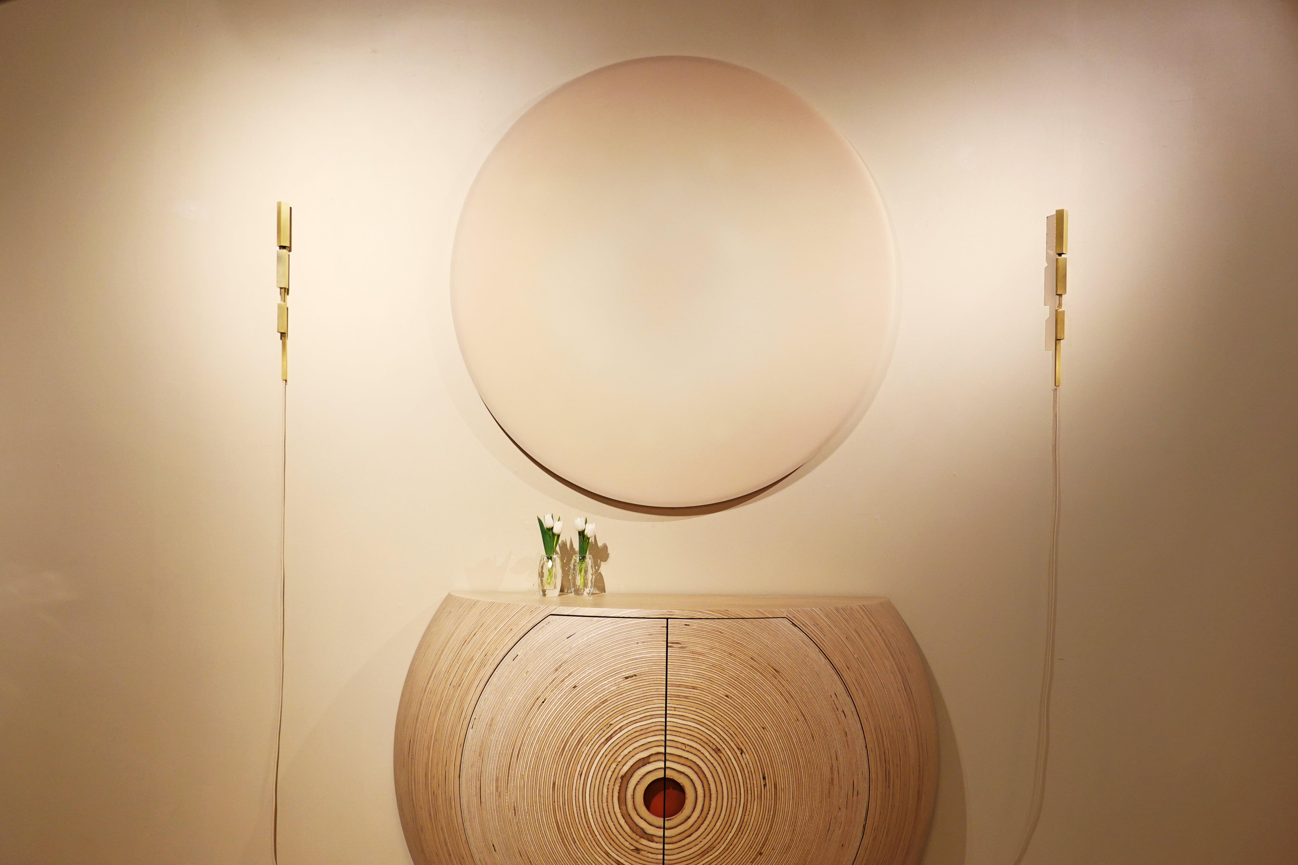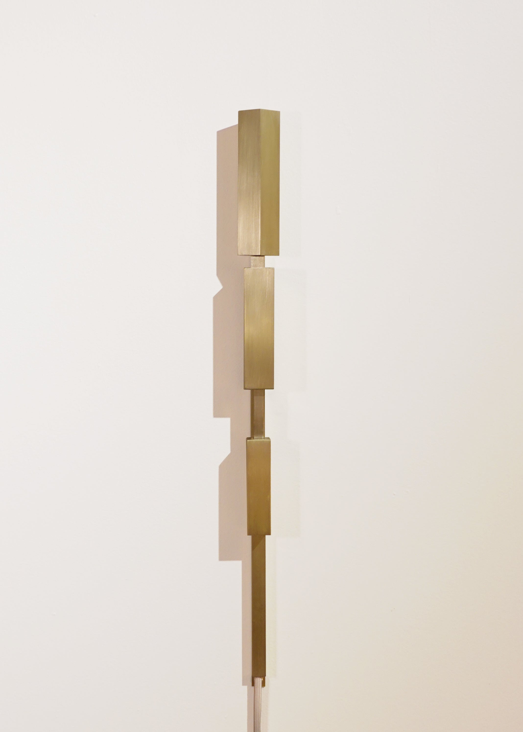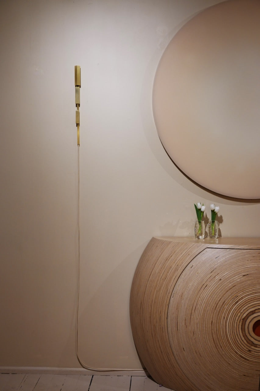 The wall-mounted piece is a brass sconce that scatters light into multiple rays with varying colour temperatures. The lamp is interactive and can be manually adjusted to modify the intensity and projection pattern: A reimagined dimming effect.