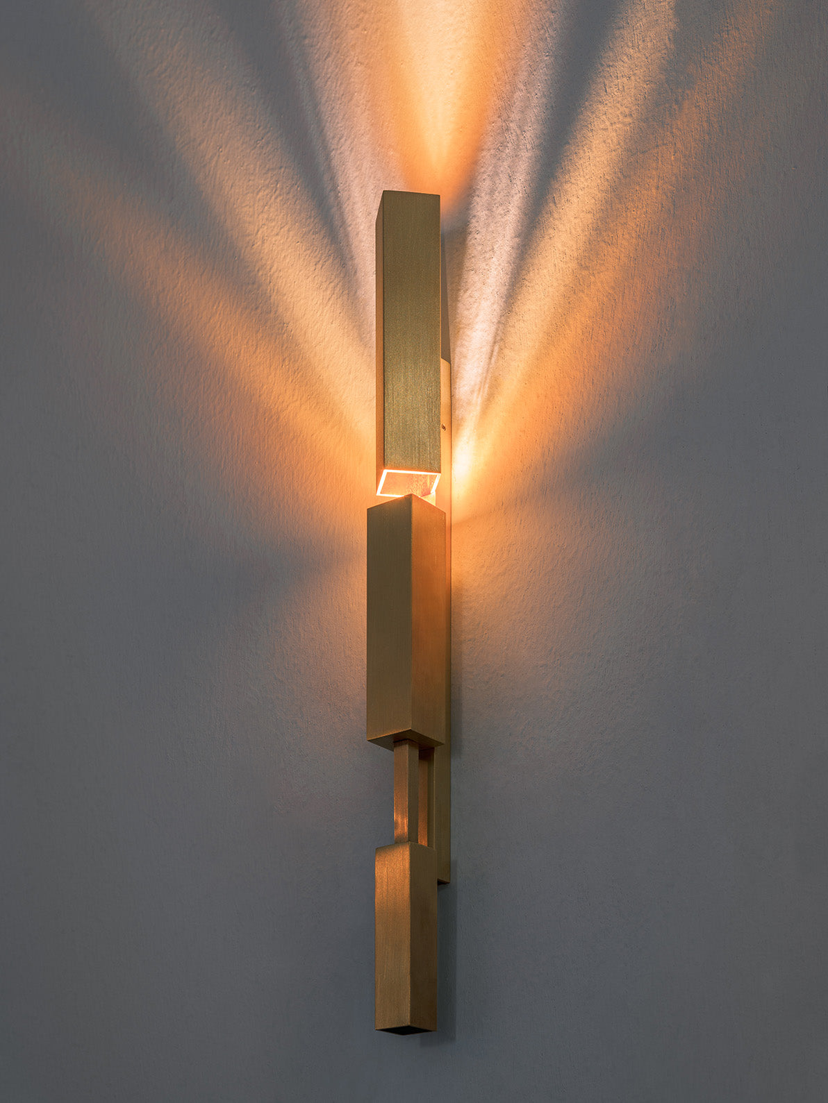 Tetray’s geometry is inspired by the Tetragonal crystal system where all atoms are organised in a lattice at 90 degree angles with two out of three dimensions being equal. The sconce’s extended vertical dimension allows light beams to reflect repeatedly within the lamp body, producing captivating light effects.