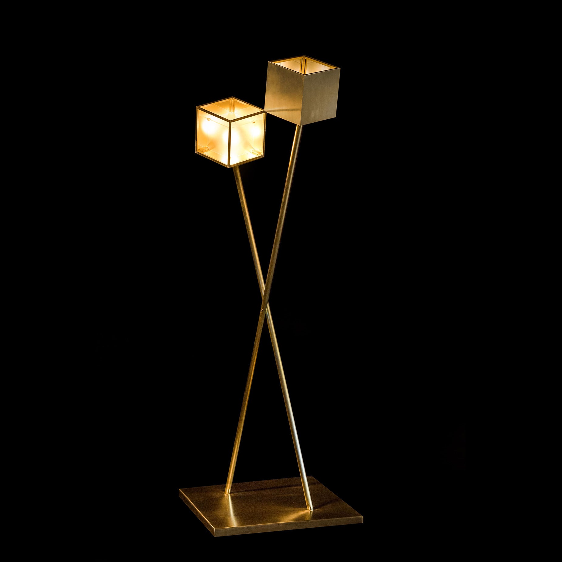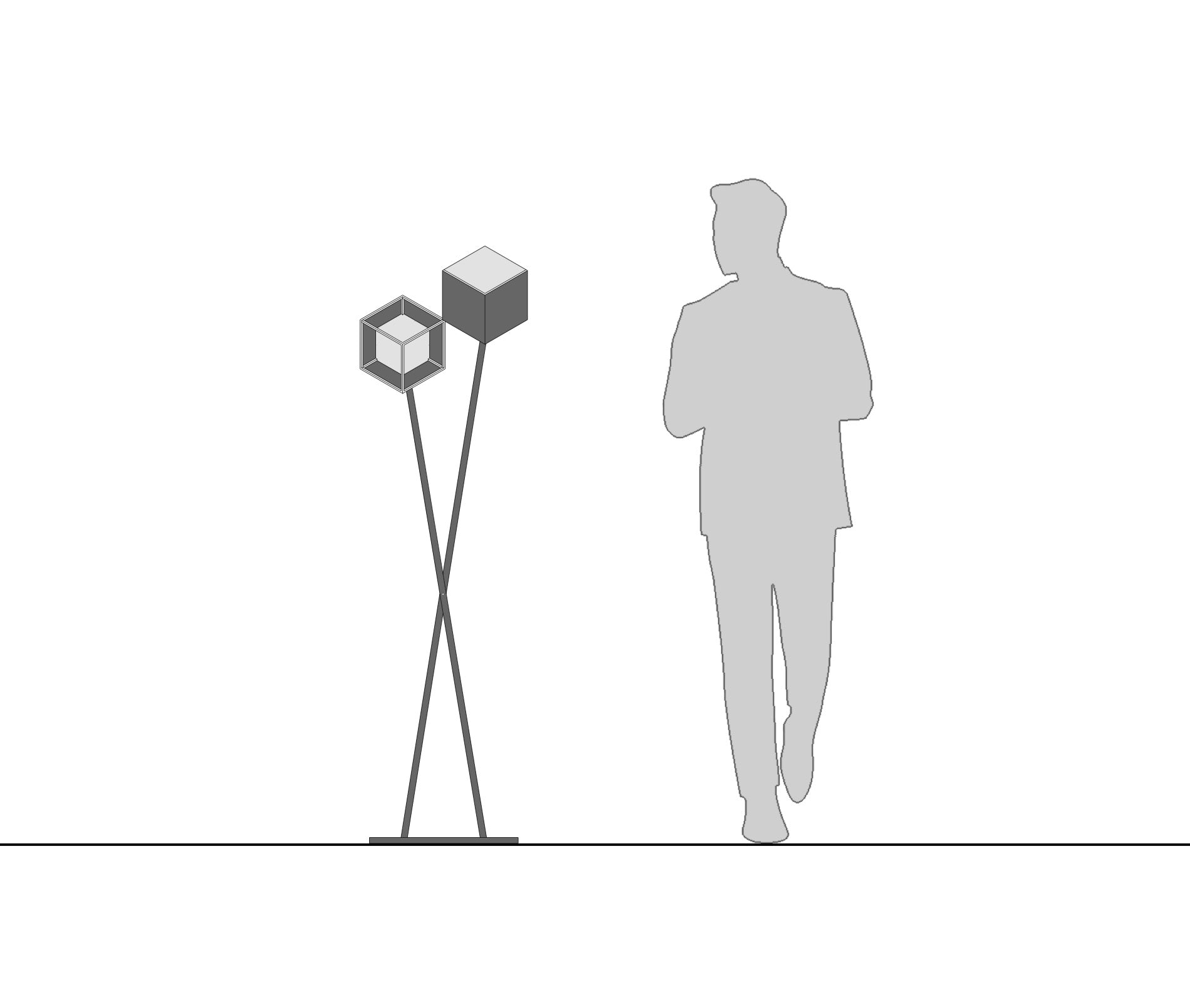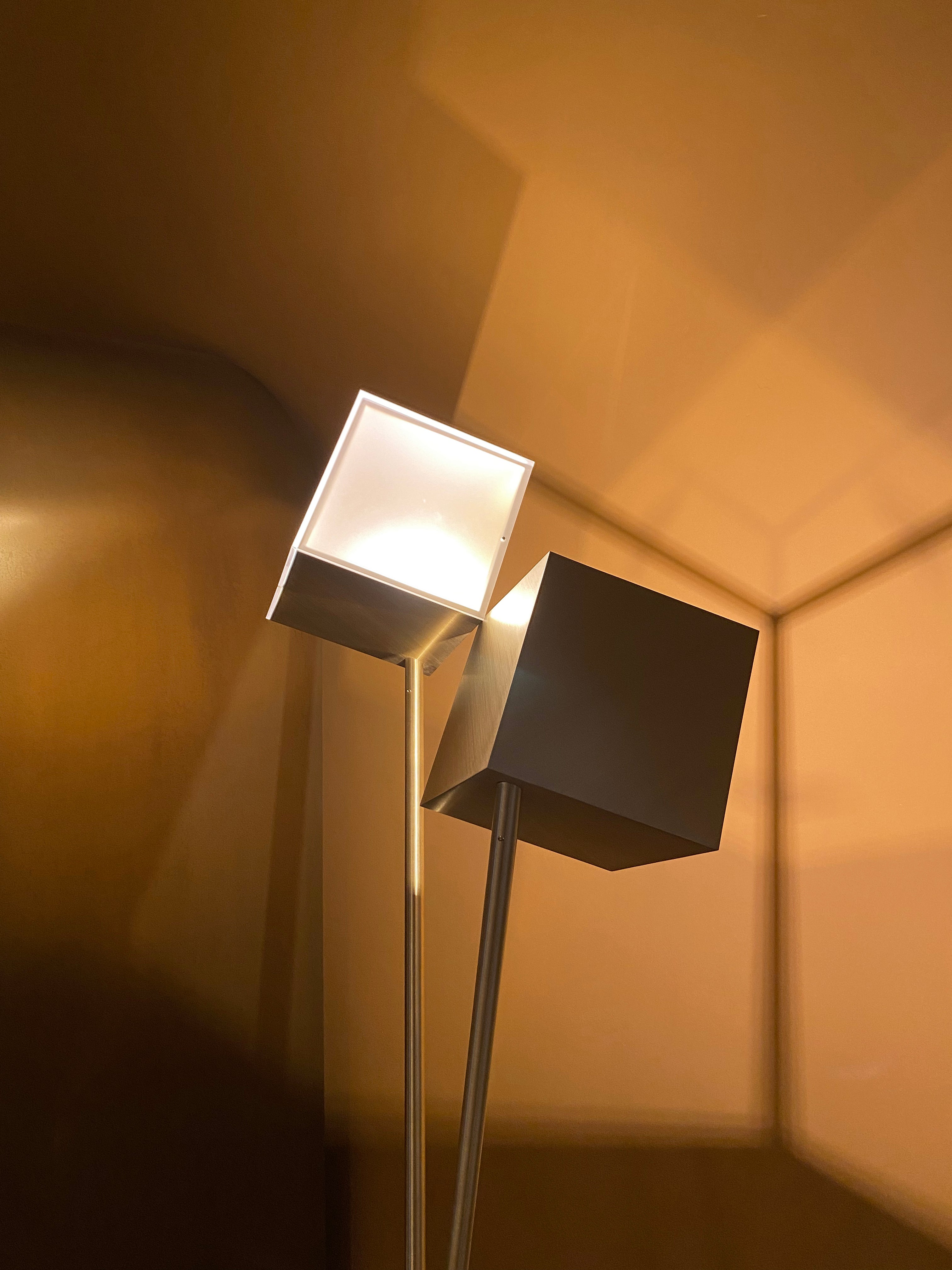 Flis is a sculptural floor lamp, a dynamic composition of two floating cubes. Each viewpoint unveils a different silhouette, a playful act between two elements reaching at their vertices, occasionally converging into a unity.