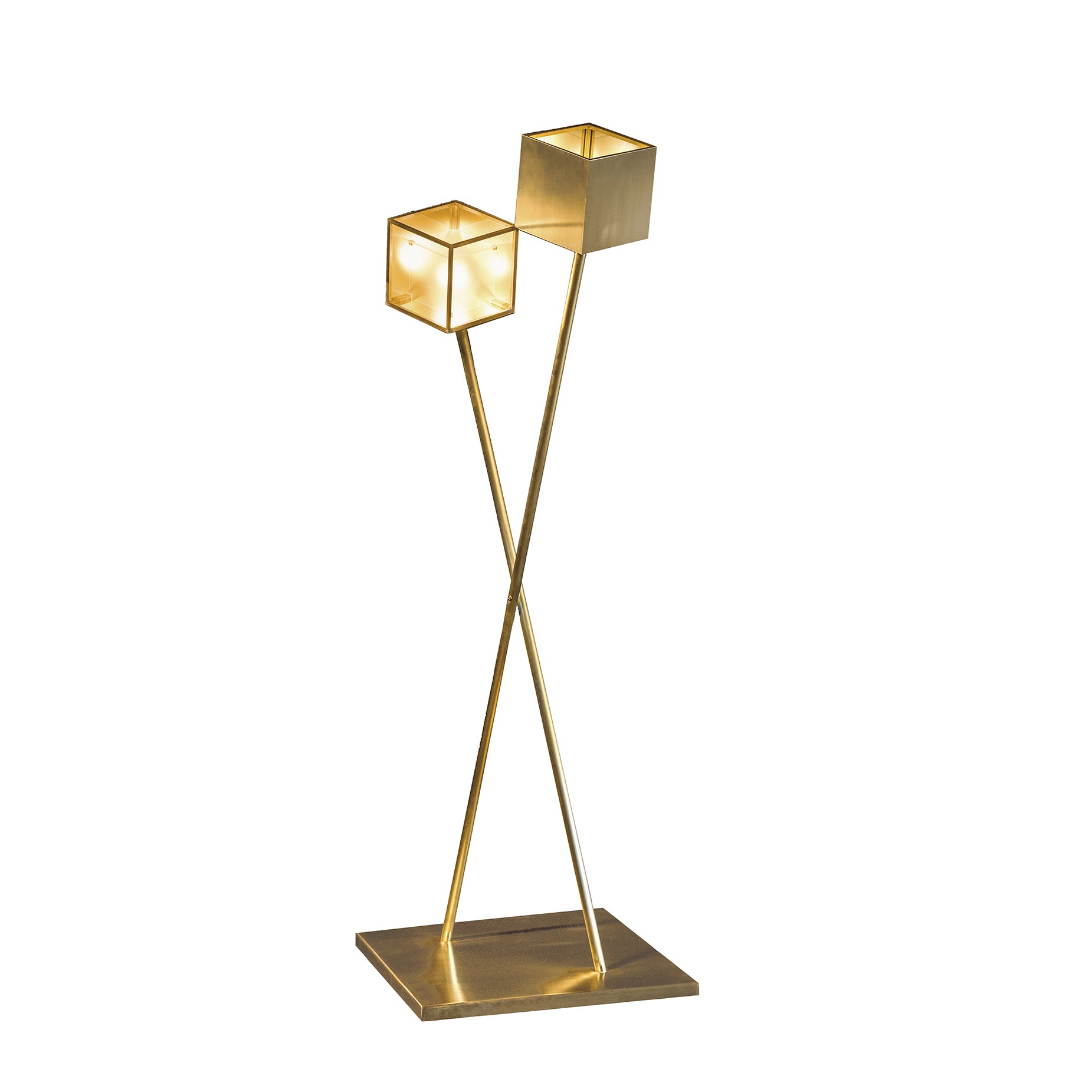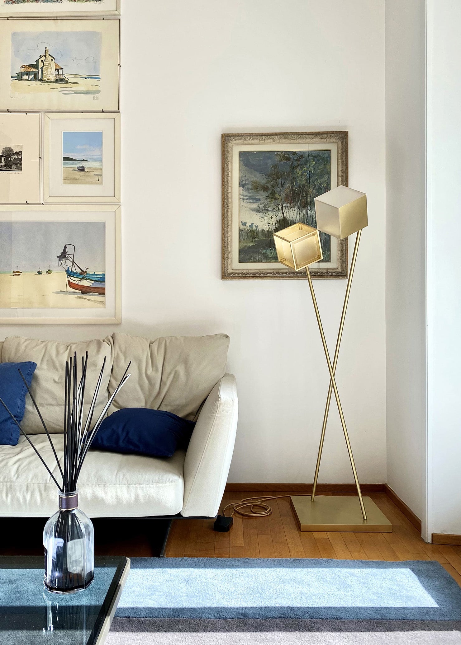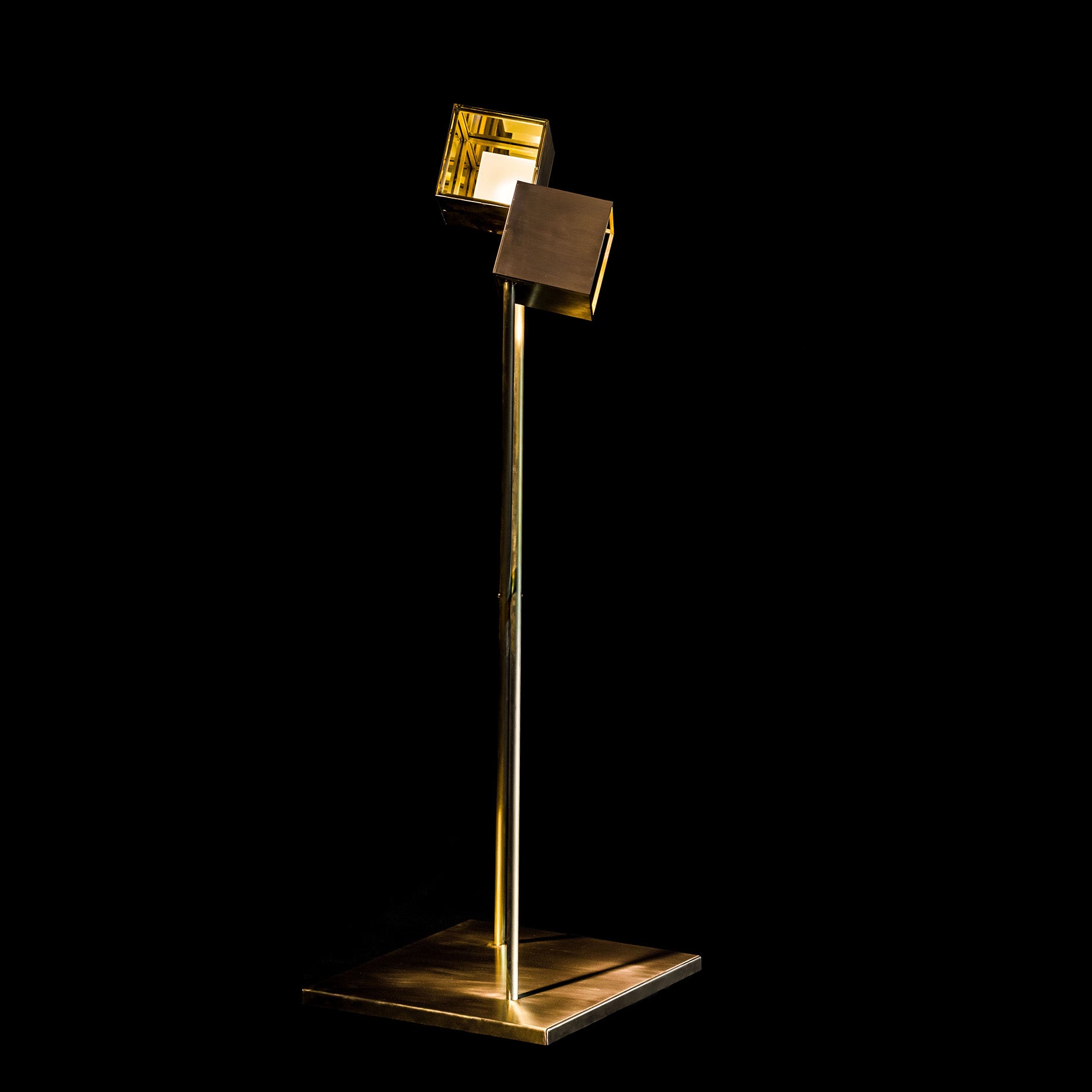 Flis is a sculptural floor lamp, a dynamic composition of two floating cubes. Each viewpoint unveils a different silhouette, a playful act between two elements reaching at their vertices, occasionally converging into a unity.