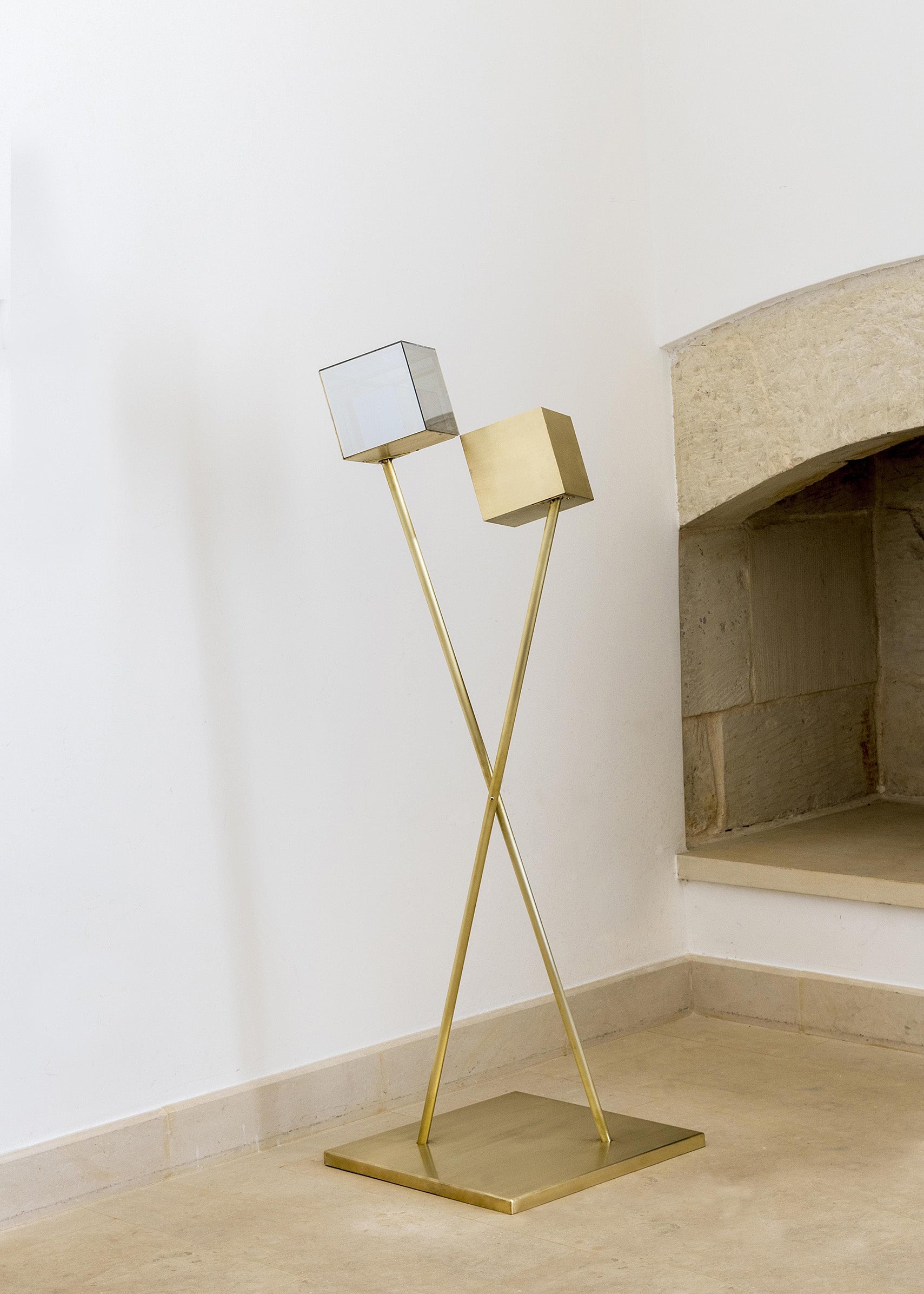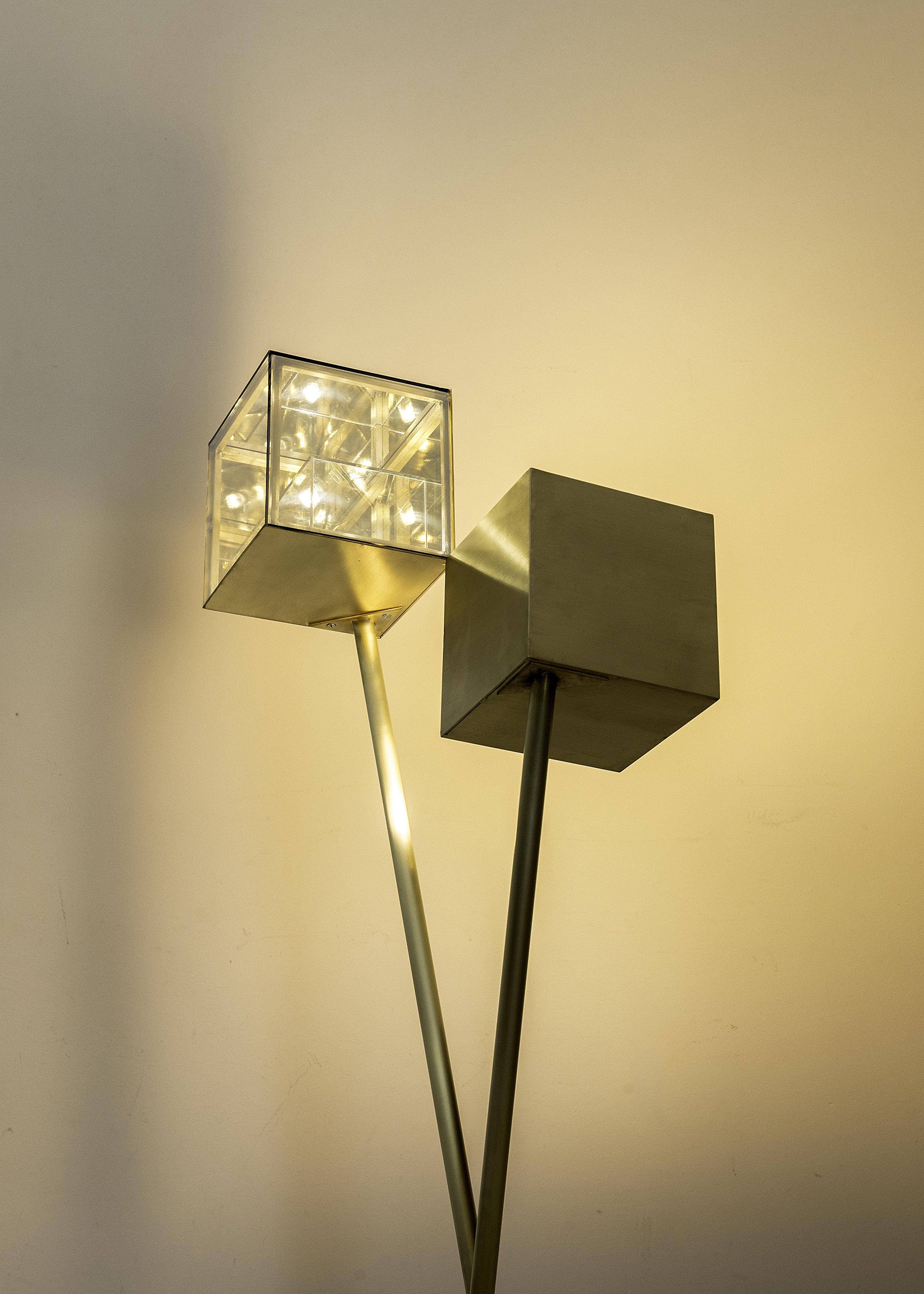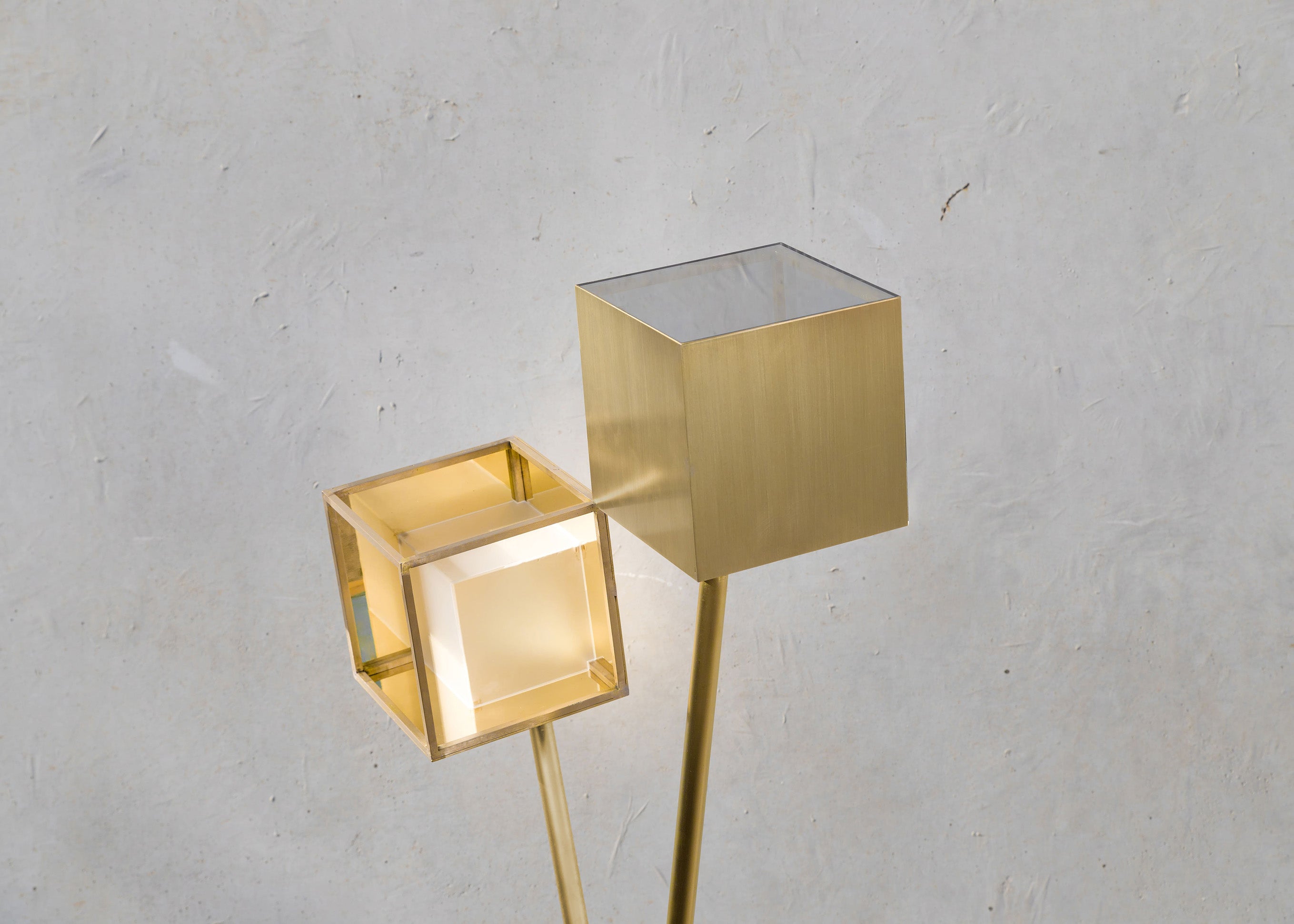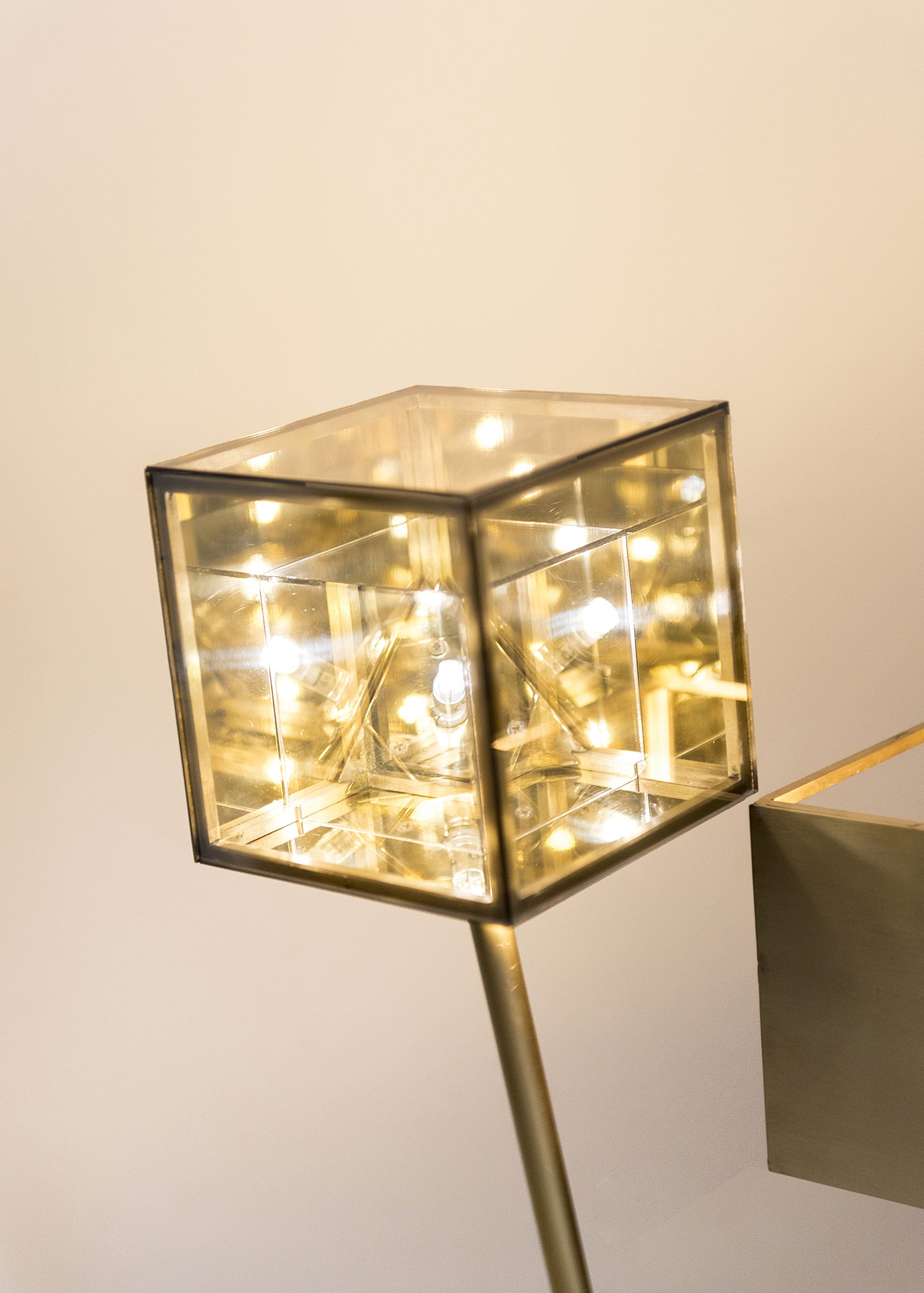 When lit, the two cubes display optical illusions within themselves, thanks to the reflective surfaces and two way mirrors they are made of. Around them, light is scattered in multiple directions, a warm glow provided by the brass