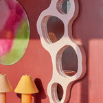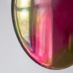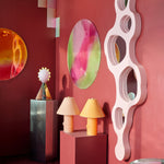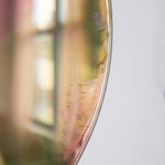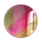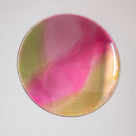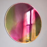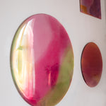 These functional art pieces build a color story through multiple layers of translucent tinted resin over a mirrored glass base. Throughout the day as the light changes, their vibrant hues shift in color and tone - kaleidoscopic portals offering new perspectives each time you view them. Courtney considers this her signature series and has been developing the technique for over two years.